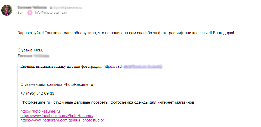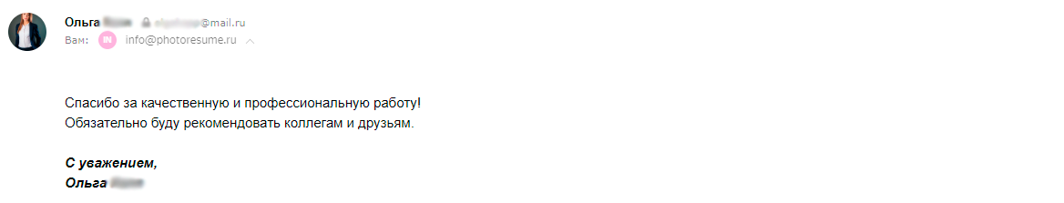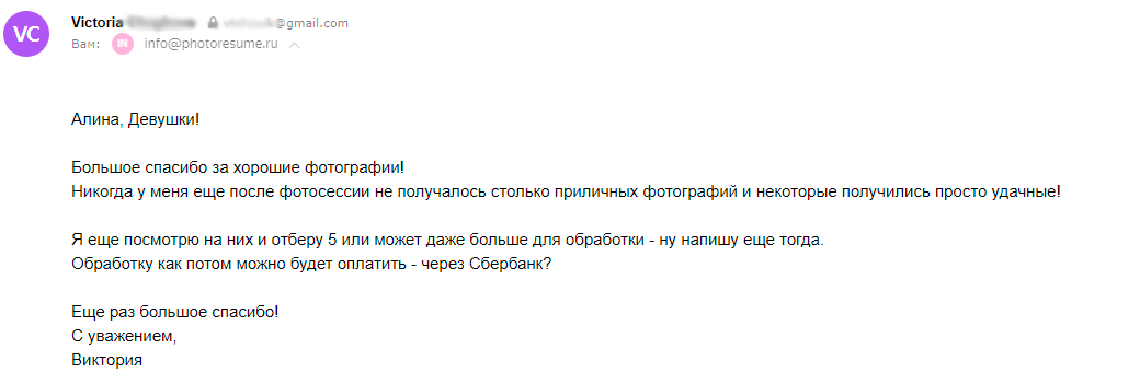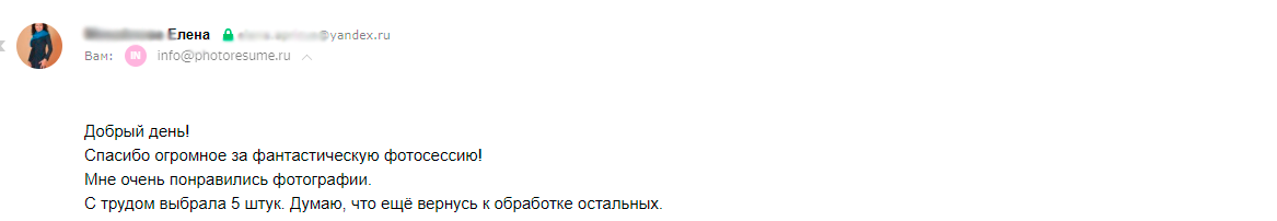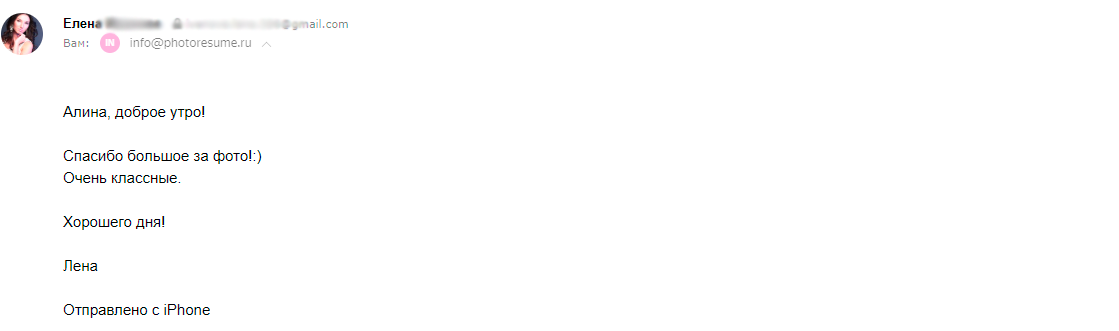 Я люблю фотографироваться, но на фото я всегда выглядела как-то не так, в общем, не всегда их и показывать хотелось. Фотограф сумел создать тот образ, в котором я почувствовала себя органично. И я уверена, что именно удачное фото, которое я и разместила в резюме, повлияло на то, что вскоре мне удалось найти хорошо оплачиваемую работу.