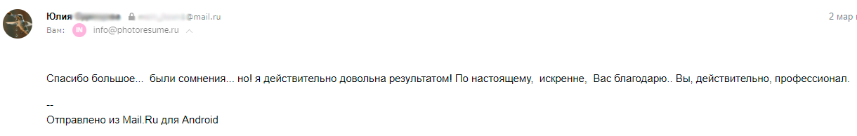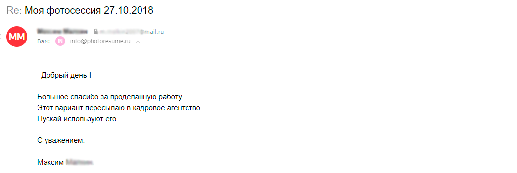 Месяц назад уволился с работы, которая не очень была мне по душе. Разослал свое резюме компаниям, где бы мне хотелось работать, но отклика не получил. Попытался переписать резюме и вдруг понял, что фото тоже надо бы поменять (оно у меня было обычное бытовое). Обратился в студию “PhotoResume”. Я не большой эстет на самом деле, но фото мне понравились. И что интересно – откликов после этого стало больше. Теперь у меня есть интересная работа, за которую мне еще и платят неплохо.
